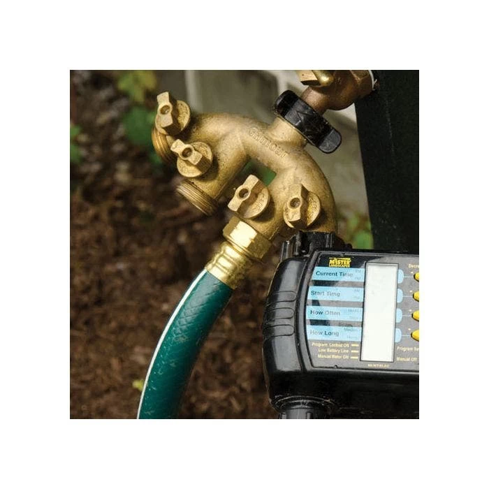 Multiple hose connections have independent shut-off valves for each port adding flexibility and versatility. Solid brass with swivel connection. Includes mounting holes for stability.