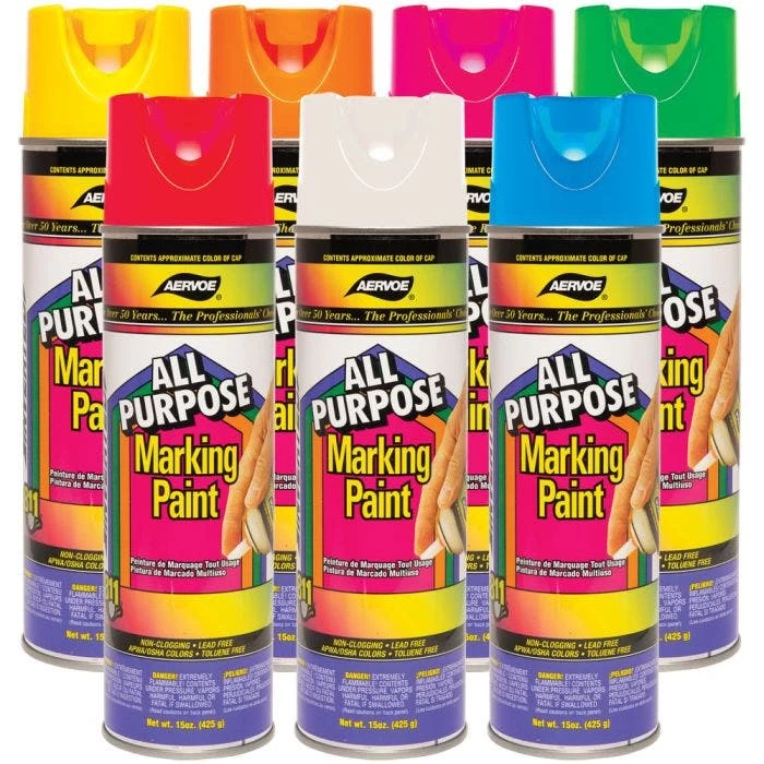Aervoe designs these spray paints for upside-down marking. Unlike some paints, these non-clogging cans can empty their contents completely. Each case contains twelve 15-ounce cans. Choose your desired color above.
