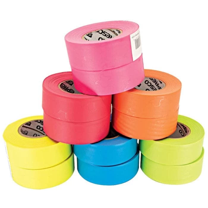 The Flagging Tape Mix Box contains six of the most popular fluorescent flagging tape colors: Glo Red, Glo Blue, Glo Yellow, Glow Orange, Glo Pink, and Glo Lime. It includes 12 rolls, 2 of each color, and each roll measures 1 3/16 inches in width and 150 feet in length.