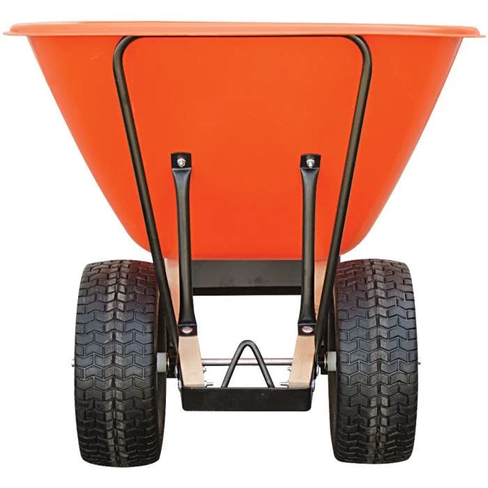 This Leonard 10-Cubic-Foot Capacity Poly Tray Wheelbarrow features a durable orange ABS plastic tray. We equip this wheelbarrow with extra-thick hardwood handles. These handles measure 1-5/8-inch by 2 inches and are 5 feet in length. Leonard Wheelbarrows feature a welded tray support, wide carriage bolt heads, and a heavy-duty undercarriage.