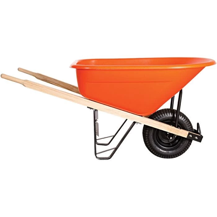 This Leonard 8-Cubic-Foot Capacity Poly Tray Wheelbarrow features a durable orange ABS plastic tray. We equip this wheelbarrow with extra-thick hardwood handles. These handles measure 1-5/8-inch by 2 inches and are 5 feet in length. Leonard Wheelbarrows feature a welded tray support, wide carriage bolt heads, and a heavy-duty undercarriage.