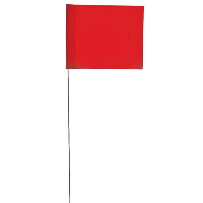 These marking flags feature a durable vinyl construction. These red flags measure 3-1/2 inches long and 2-1/2 inches wide. Glue secures the flag to a 21-inch wire staff. Each bundle contains 100 flags.