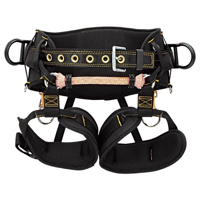 Weaver’s WLC-700 features a floating bridge attachment point allowing increased maneuverability range. The bridge is constructed of Spectra fiber over a nylon tubular webbing core creating high strength, abrasion resistance, and color components that provide better visibility of inspection. The wide back pad extends forward on the hips and the 4″ wide leg straps are also padded with memory foam for both good comfort and support. Easy adjustment buckle waist belt. The saddle back is outfitted with two stainless steel snap / 2″ ring combinations to hold all your gear. Small front and back Dees included as well for optional suspender attachment. Size Large. Ship wt. 6.8 lb.